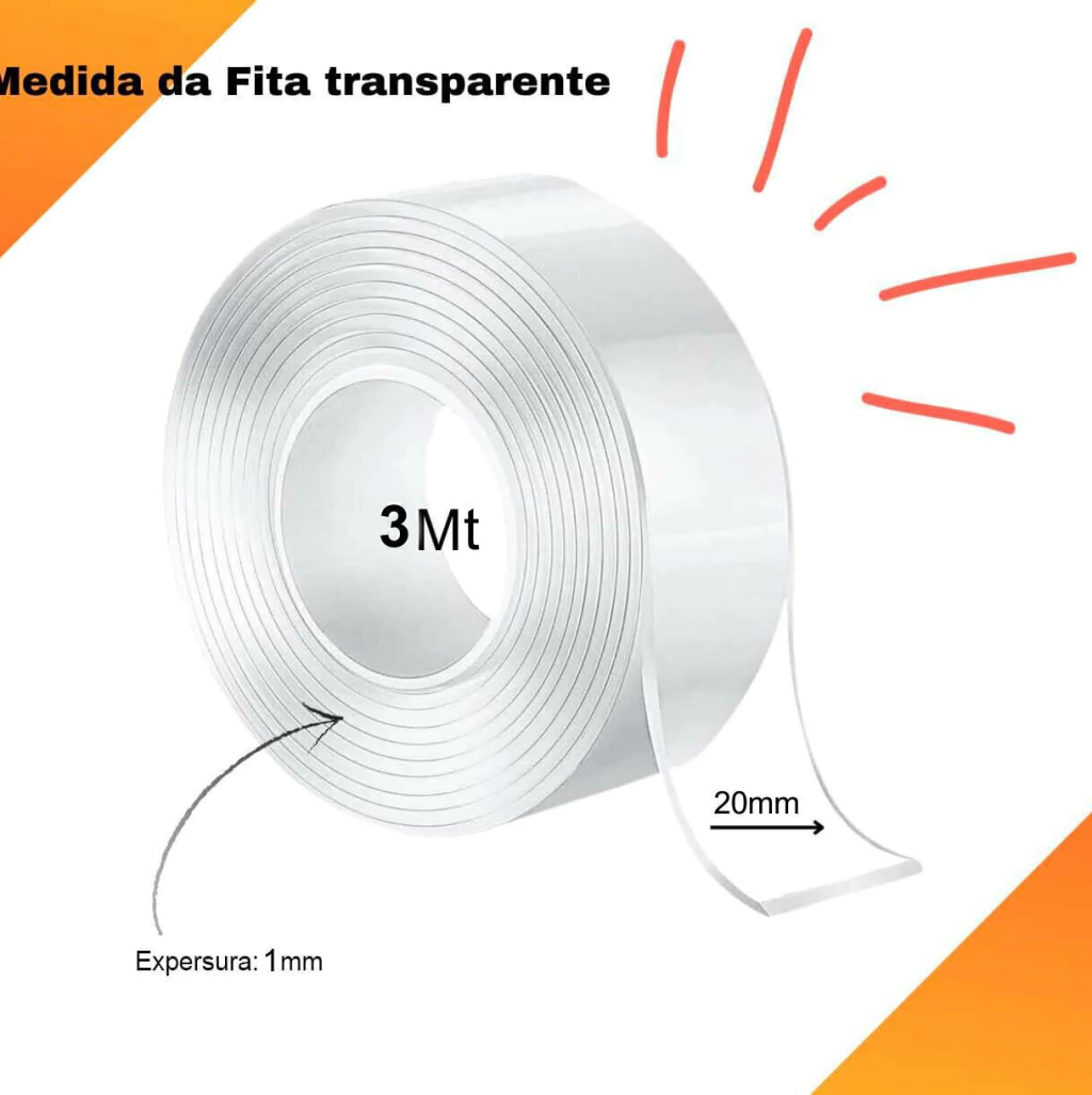 Fita dupla-face de adesivo transferível transparente de alta fixação indicada para fixação de placas de identificação, canaletas, PDVs, expositores e displays, objetos em geral e em diversos tipos de substratos.